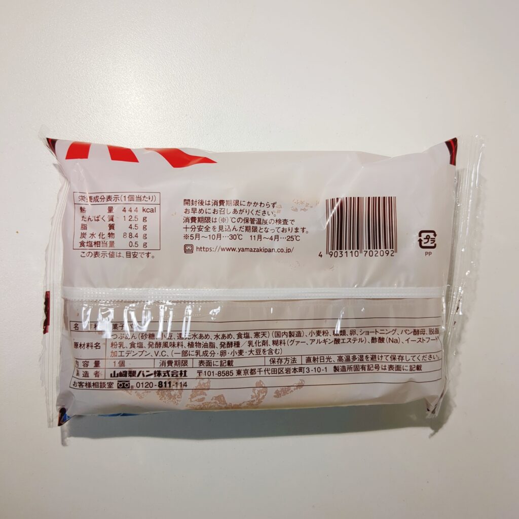 原材料名としては、つぶあん、小麦粉、盗塁、卵、ショートニング、パン酵母、脱脂粉乳、食塩、発酵風味料、植物油脂、発酵種、乳化剤、糊料などが並んでおります。